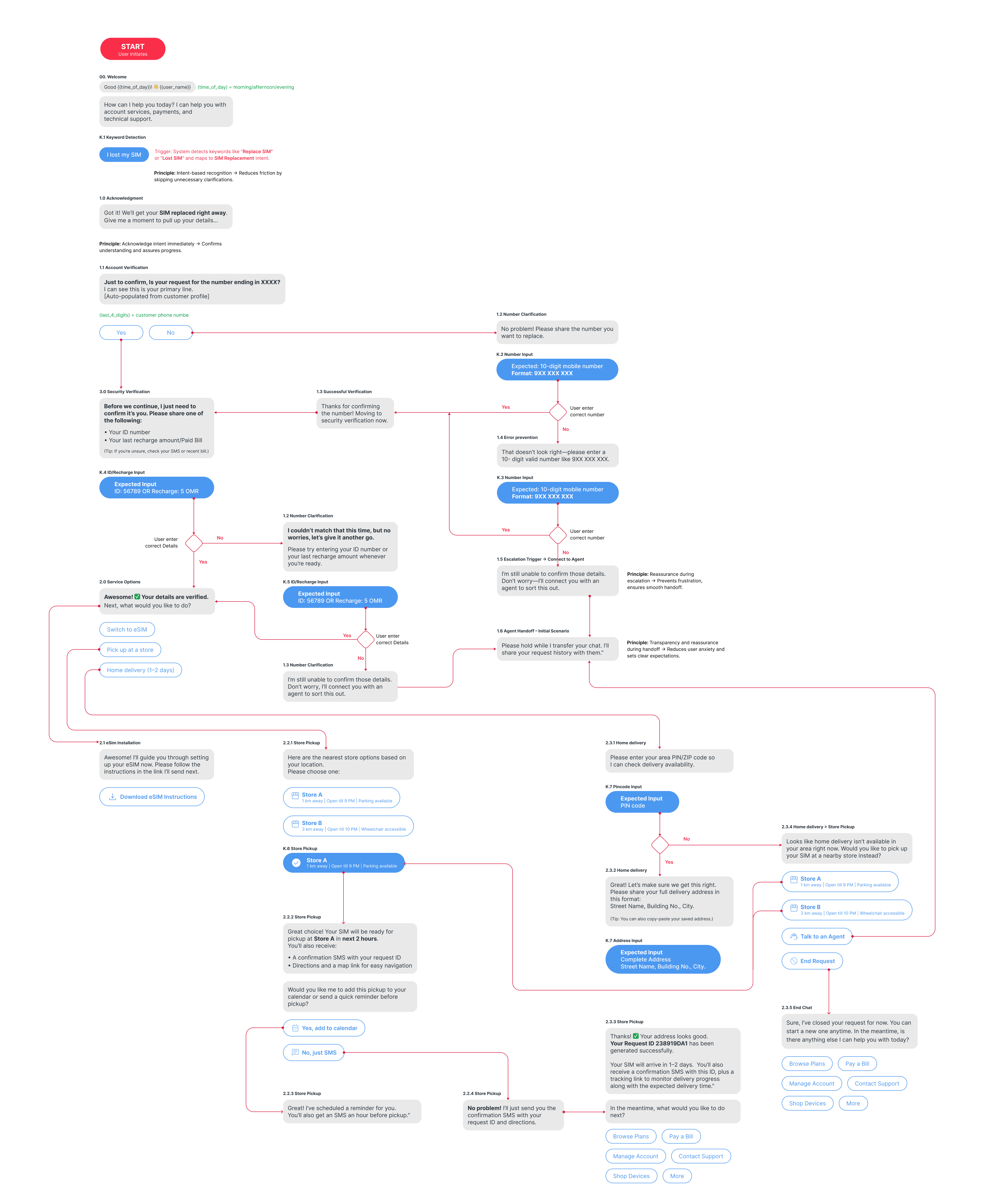Defined conversation tone, principles, and escalation flow.